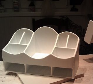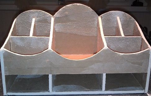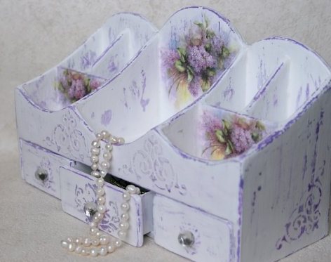 A chest of drawers can be assembled without a frame, using arched gypsum cardboard and fantasy. Drywall parts are cut out of the right size and shape, which in the future will serve as the bottom, walls and shelves of the chest. In advance on the pieces of plasterboard it does not hurt to map out the locations of the partitions of the future chest or bedside table. Combining all the details of the design can be super-glued. As boxes, you can use plastic containers or make them from the same drywall.